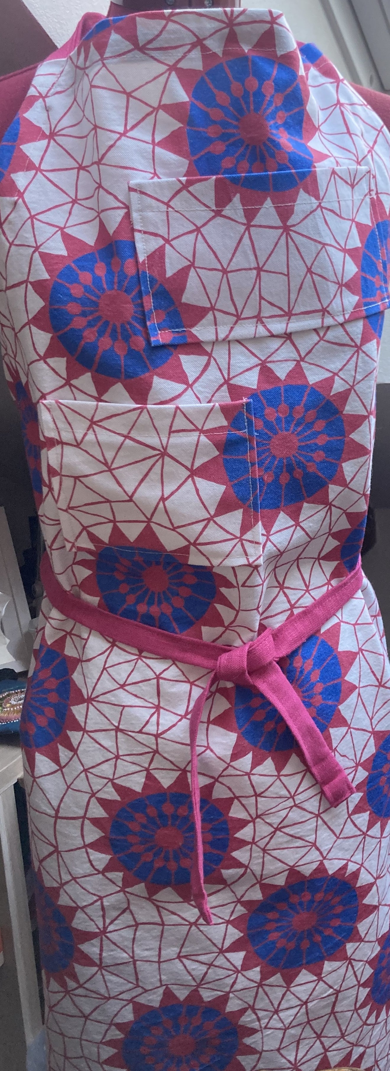 Textiltryck i bomull, rosa-lila mönster med vit botten, kan ändra mått efter storlek på person.